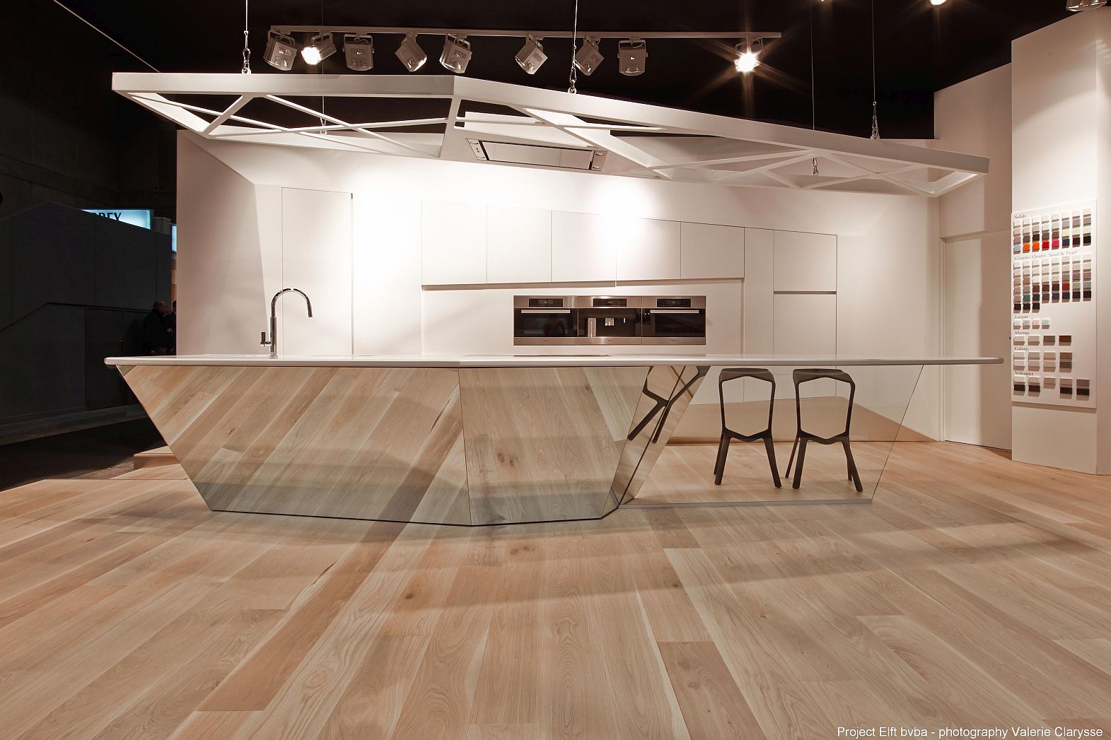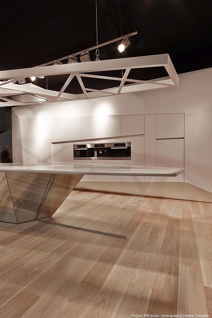 Pour mettre en valeur le matériau polyvalent HIMACS, un stand d’exposition a été conçu en s’éloignant des conventions. Les lignes inclinées remarquables font du design un véritable accroche-regard. Cet effet est encore accentué par la construction frappante de la hotte. Un socle recouvert de miroir crée un effet d’agrandissement optique de l’espace.