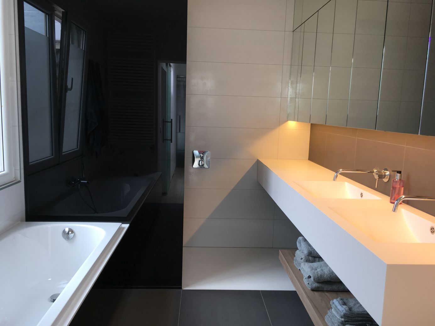 Dans cette élégante maison mitoyenne, on a opté pour une ambiance luxueuse. Une magnifique paroi de douche en verre donne l’impression d’être dans une chambre d’hôtel. Un superbe meuble sur mesure a été choisi, entièrement en solid surface avec des lavabos intégrés. Hygiénique et pratique, mais aussi luxueux. Une tablette en bois sous le meuble suspendu offre de l’espace pour les serviettes et la décoration.